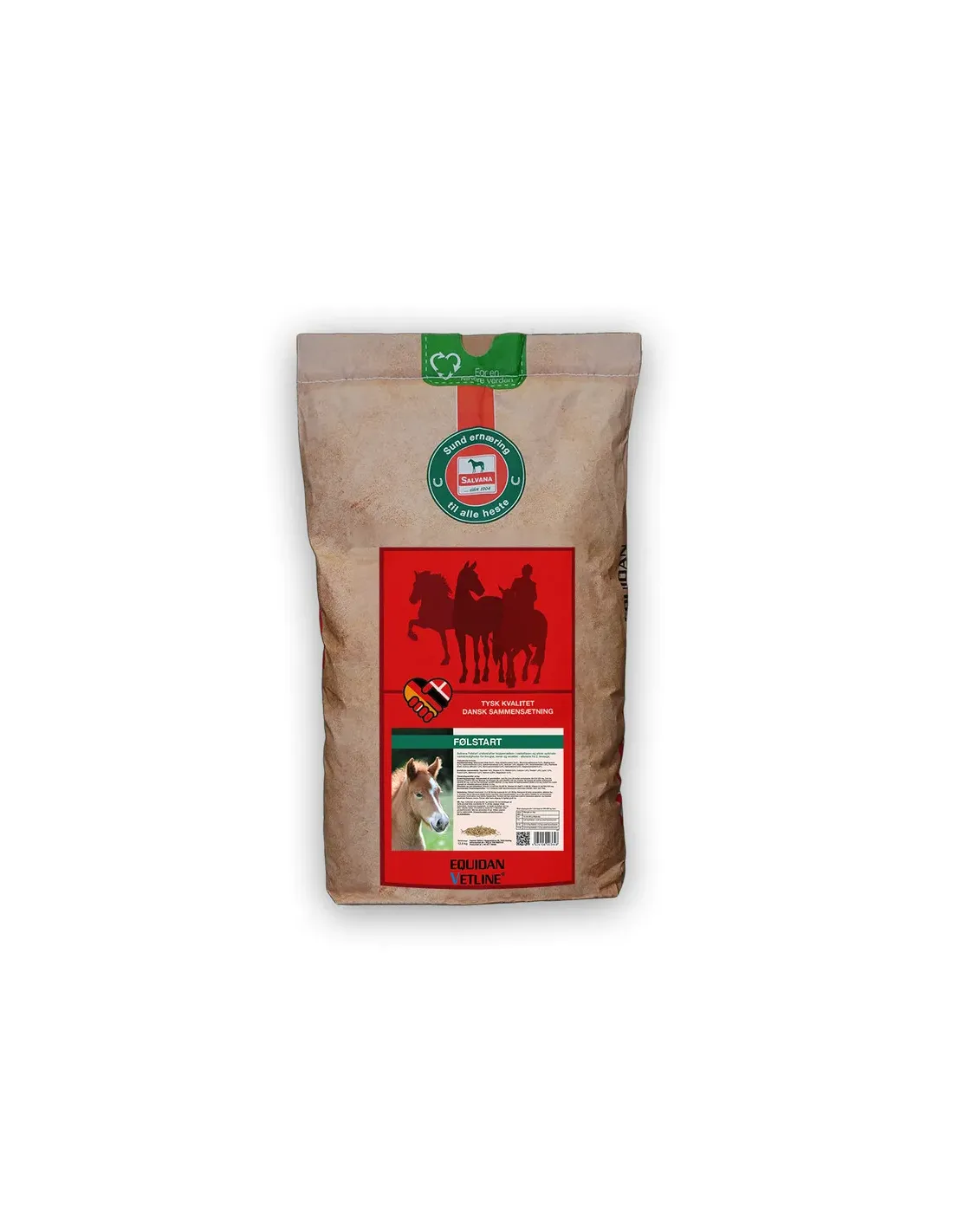 Salvana Følstart - den bedste start på livet til dit varmblodsføl! Fodring af føllet i det første leveår er afgørende for at undgå vækstforstyrrelser og ernæringsmæssige ubalancer senere i livet. Salvana Følstart er beregnet til meget tidlig anvendelse og understøtter hoppemælken i vækstfasen, sikrer optimale vækstmuligheder for knogler, sener og muskler samt brusk og sene dannelse. Produktet indeholder også en høj mængde gode bakterier for en sund tarmflora og en god fordøjelse. Salvana Følstart er velsmagende og let at fodre, da det gives i koncentreret mængde sammen med hoppemælken og græs/hø.