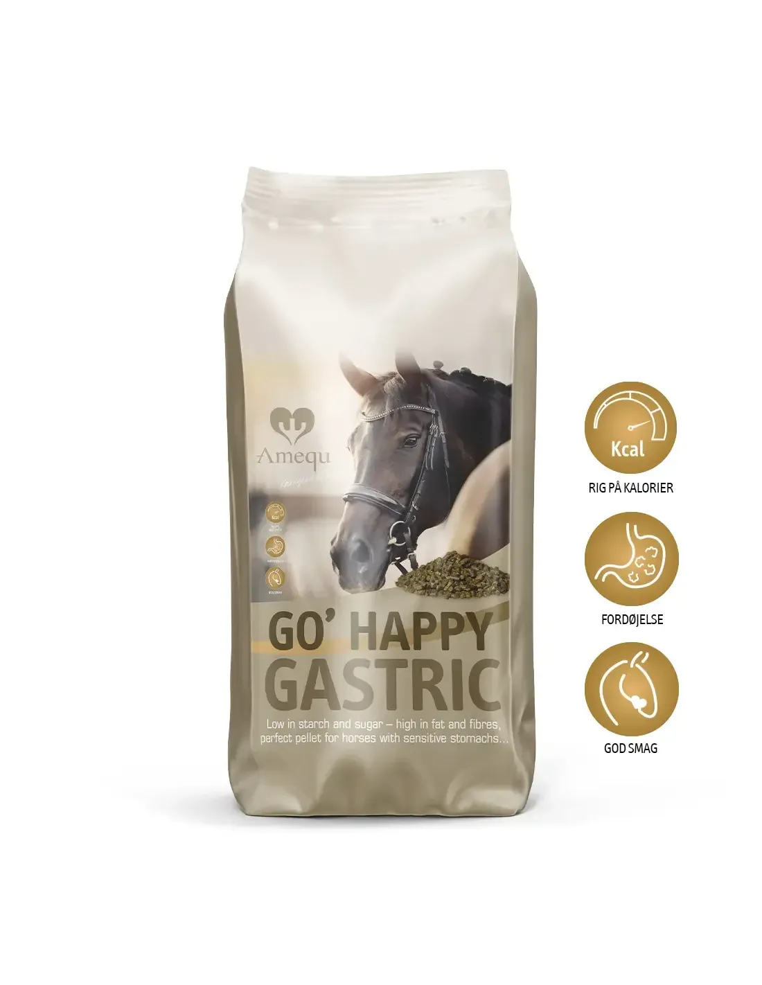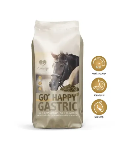 Sart mavesæk og fordøjelse beskyttes med en kombination af ACID BUF, der neutraliserer mavesyre og stimulerer et sundt miljø i mavesækken, og ølgær som har en positiv virkning på de gode tarmbakterier. Derudover er GO' Happy Gastric baseret på forskellige typer fibre fra f.eks. æble, hørfrø og selvfølgelig hestens naturligste fødekilde græs, som giver en god diversitet i fibrene til en god fordøjelse.